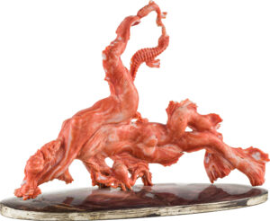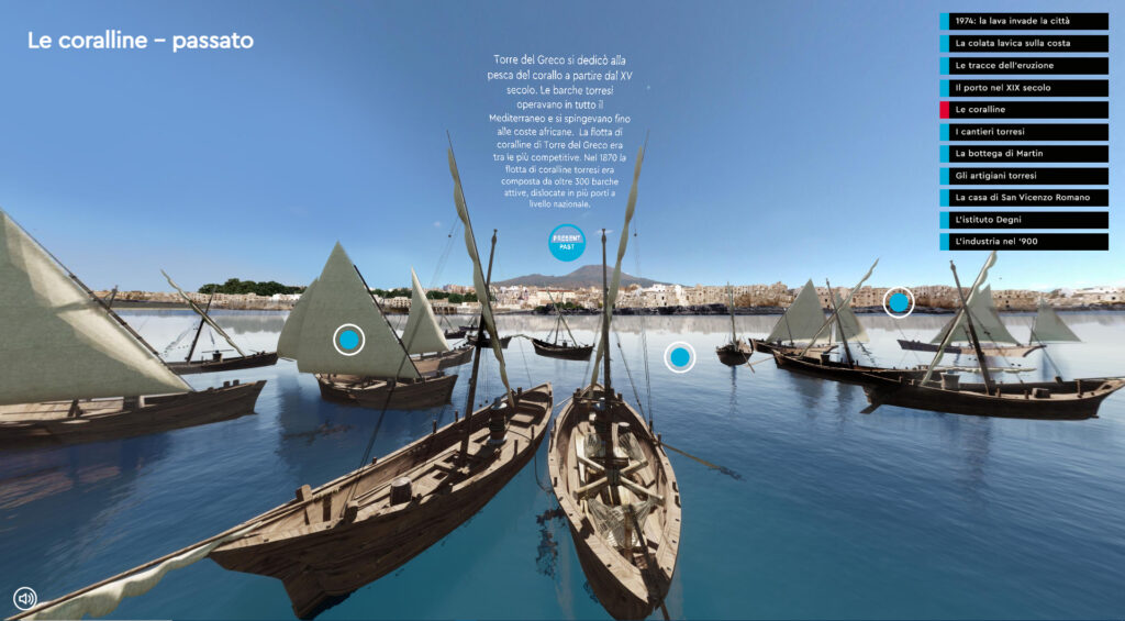 Due ologrammi raccontano il dramma della pesca del corallo, effettuata dai pescatori torresi mediante le barche dedicate, denominate coralline, spesso aggredite dai pirati saraceni, e il momento della nascita della lavorazione del corallo a Torre del Greco, importata all’inizio del 1800 dall’imprenditore francese Bartolomeo Martin, che coinvolse moltissimi operatori, soprattutto donne.